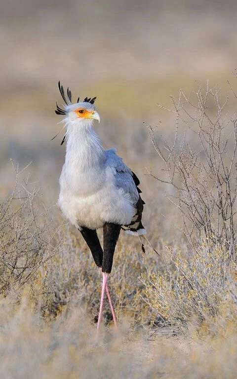 蛇鹫的腿像鹤腿一样修长挺拔,上半部长着黑色的短绒毛,看起来好像穿着一条马裤。小腿和脚表面长有很厚的角质鳞片,使其行走于灌丛时或捕蛇时脚部不致受到伤害。平常,蛇鹫就是如陆此迈着自己纤巧的长腿优雅地在非洲草原上走来走去——文雅的风度和独特的模样在猛禽家庭中独树一帜,使人很难想象它们捕猎时的凶猛。