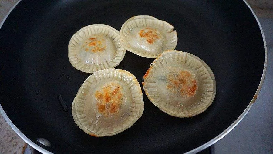 制作:面粉用温水调成面团,揉匀、搓条、摘成剂子,用饺杆杆成直径8厘米的圆皮,并顺长放上馅心,对折成半圆形,将边叠起、捏紧,然后将半圆形饺子的角向圆心处弯,接头处用蛋青粘住,形成一个圆形,把圆形边用手指推捏绞成麦穗状花纹,将中心隆起的部分朝上,平放在笼内蒸8分钟即可。