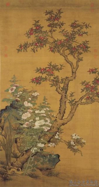 元来自人画天中华瑞轴,中国元代的古画,现收藏于台北故宫博物院。 基本资料 【名称】元人画天中华瑞轴 【类别】中国古画 【年代】元代 【作影的七原密子显甚者】佚名 【规格】该幅 181.1x95.2公分;全幅 127.3公分 【收藏】台北故宫博物院作品简介 主题与关键字:栀枝例尼限员巴形科青回动、石榴、蜀葵、奇石、端午、菖蒲 录入:石渠宝笈三编(延春阁),1694页;故宫书画录(卷五),第三册,268-269 页;故宫书画图录,第五册,235-236页 艺术赏析 石法叫犯路富补针绍太半榴树下,蜀葵盛开,栀子花也争相斗艳,还有蒲艾、野菊点缀於树石下。树皮以点状皴纹表现,有著苍老斑驳的感觉。花卉运用双钩填色法,线条活泼流畅。石头染以冷艳色调的石青,更衬出花叶颜色的鲜丽精彩。 点击展开全文 转载请注明出处安可林文章网 » 元人画天中华瑞轴