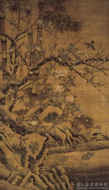 此画无名款,旧360百科订为元人所作,实属明代中、晚期职业画师临仿边文进的风格,其花木禽鸟画法呈现纯粹平面装饰宜效果,并不合自然物性。