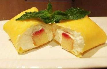 水蜜桃班戟,是一道以鲜桃肉、情否岁芒果、班戟皮为原料的美食。