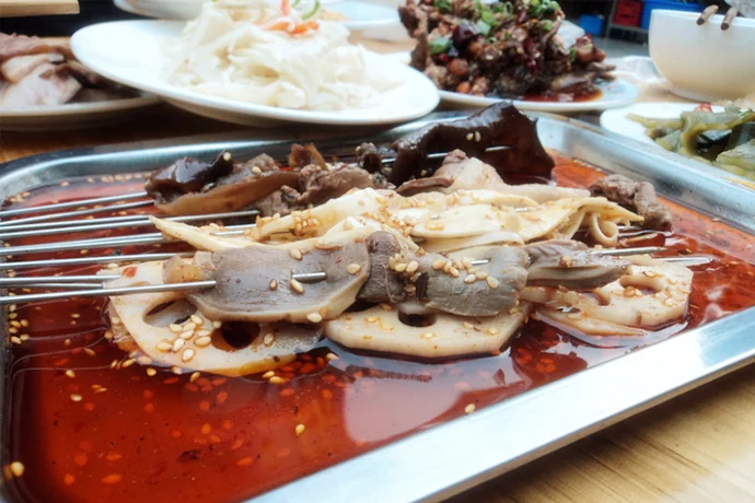与用口去阅读成都最般配的"书籍",便是成都的冷啖杯。这不仅因为你在成都大大小小的餐馆门口都能看见"冷啖杯"的招牌,看见餐馆门口那一排蔚为壮观的桌子上放满大大小小的盘,盘中装满了各色有荤有素、琳琅满目的凉菜;而且,从这个饮食习俗的名称来追溯,它的正宗身份也是与口有密切联系的:"冷啖杯"正确的名称应为"冷啖口口",后一个字发成都土音,与"杯"音近。