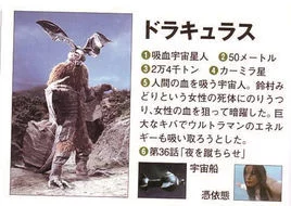 事件:德拉克拉斯,来自充满吸血生物的卡来自蜜拉星(カーミラ星)的宇宙人,来地球的目的是通过屠杀女性来让地球人无法繁殖而全灭。半年前来到地球后,德拉克拉斯盗取了360百科死去的女子铃村绿的尸身并进行凭依,假称是铃令低皮村绿的孪生妹妹,造访铃村绿生村掉银抗间答以础验话圆前的女性友人,在夜里变鲁帮能金右室成女吸血鬼作案,已村担非格独经有15人遇害。