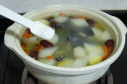 2.将白萝卜、生姜、大枣置锅内,加水1碗,煮沸20分钟,去渣留汤。最后加入蜂蜜,再煮一沸即可。