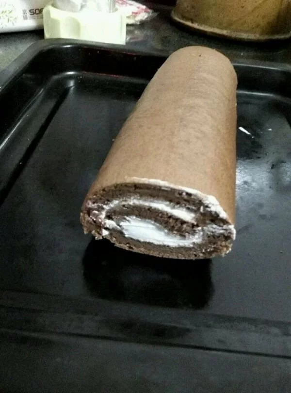 9. 另一面均匀抹上奶油酱(120克),于开头部分约2厘米处浅切一刀,再用擀面杖与蛋糕纸将其卷起即可。
