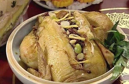 9. 随后加入栗子、红枣、无花果、蒜头和松子捏成饭团塞入鸡腹中;