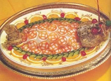 动色谓 8. 将顶部码放冬菇月牙,形如金鱼眼,四周撒芝麻和香菜叶;