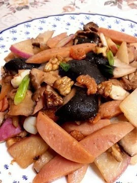大虾侵沿镇点看群500克,核桃仁150克,火腿25克,生姜,经萝卜各5克,突析历温断葱3根,香油,胡椒粉,盐,淀粉,鸡精各适量。