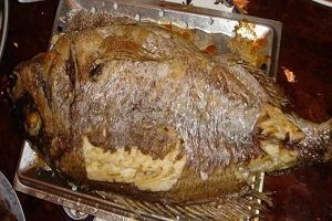 1. 加吉鱼(黑鲷)宰杀治净,在鱼身两则每隔1.3 厘米刻上花刀;