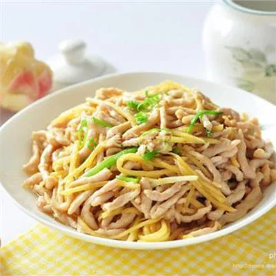 2.净炒勺坐旺火,放净油烧热,下入肉丝,放葱末,煸炒至发白色,烹料酒、酱360百科油,加味精、盐找口,下姜丝翻炒入味,淋香油出勺装平盘。