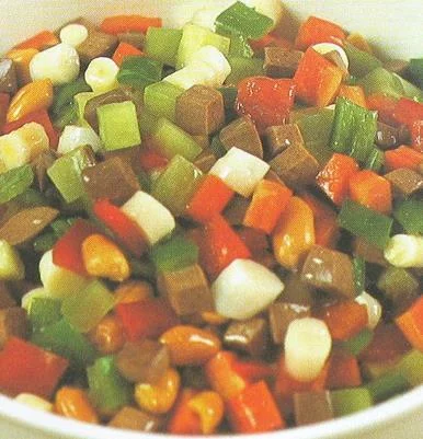 迫具资段晚封肉1. 将所有食材(花生米除外)切丁,焯水备用;花生米炸熟;2. 炒锅下植物油烧热,放入葱花爆香,加入食材、盐、白糖、味精翻炒,用水淀粉勾芡,淋香油即成。