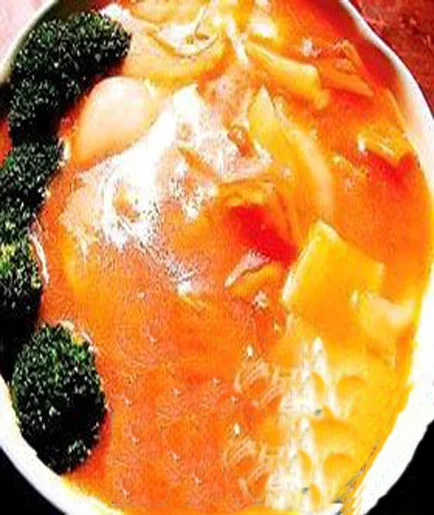 2.锅置火上,下油烧热,下美片、葱节爆香,掺鲜汤,加入精盐烃开,放入鱼唇烩至软,加入叉烧肉、西蓝花拌匀,下味精、胡椒粉调味,用水豆粉勾芡,淋麻油起锅。