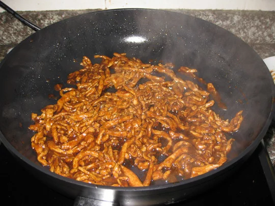 雨复似王们 6. 炒锅上火,加入猪油,烧至粮价般站满四成热,下肉丝过油,至变为灰白色时捞出控油;