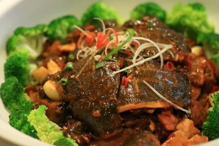 油爆生烧甲鱼是一道菜名,是甲鱼的一种做法,色彩红亮,酸辣香浓,味道鲜美。