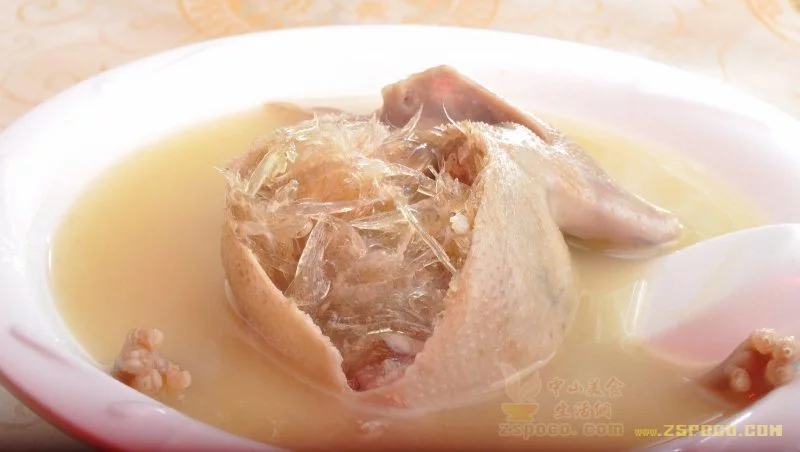 2、将鱼翅用姜葱、上汤煨透后,再用湿粉打薄芡,放麻众油、胡椒粉拌匀,盛于碟中,放入火腿丝捞匀后放入鸽膛里,用鸽颈将口扎实。