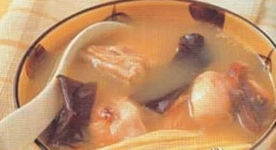 做 法: 将腐竹、黑木耳分别用清水浸软、洗净,腐竹切段;姜片枸杞洗净;兔肉洗净,切块。起油锅,下姜片,爆香兔肉,加清水适量,下黑木耳、腐竹、枸杞,用文火焖熟,调味即可。饮烟汤吃全部用料,每天1料,连用7天为1疗程。