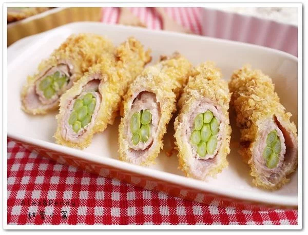 (2) 用2个鸡蛋加糯米粉调成蛋糊,把里脊卷在蛋糊中拖一下,放在热油炒勺中炸酥。每卷切成斜角6段摆盘,撒上椒盐即成。