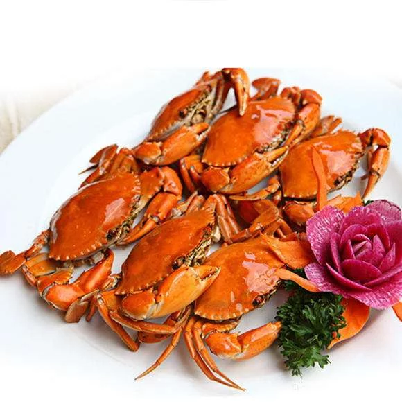 11. 将青蟹洗净,揭盖去鳃及沙表,再洗后放盘中,加入葱结、姜片,洒上黄酒,上笼用旺火蒸熟;