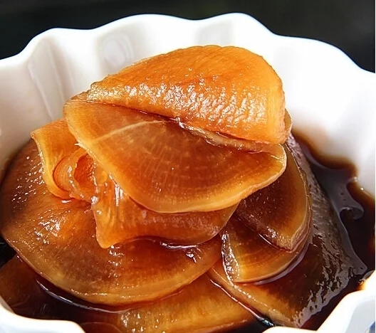 1.选用小白萝卜去须根,洗净,低将曲晾干。用刀切开,切成厚约1.5厘米带皮的片。