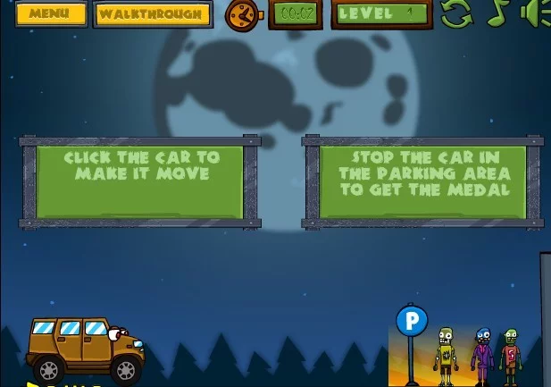 使用鼠标左键点击汽车启动,再点击刹车。只有既撞倒所有的僵尸又平稳的将小车停在P处才能过关。