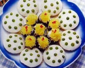 2. 取大酒杯12只,杯同抹匀熟猪油,分别入鱼肉馅并抹平,每个馅上插入花生米5粒,逐一做好后,连酒杯上笼蒸约5分钟至熟至取出,脱出酒杯,码放在盘内。