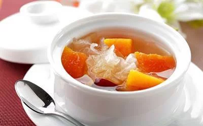 三色银耳羹,是中国汉族传统菜品之一。制作原料主要有银耳、紫薯、南瓜、石榴等。