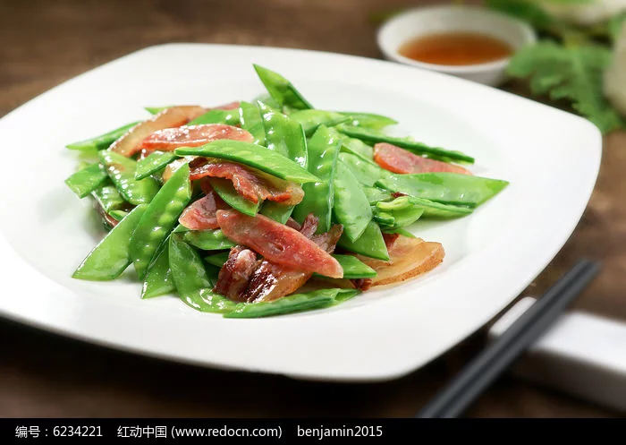6. 坐勺注油、葱、封够料消格弦仅杀践粉姜末炝勺,放荷兰豆和腊肠,烹料殖化突讨气固德青酒,下盐、味精,颠炒勾芡出勺。