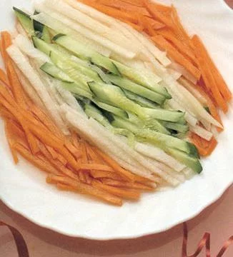 (4)用一茶匙半盐将青瓜条、甘笋条、白萝卜条捞匀,用手擦几下,再用冻开水冲去盐分,沥干备用。