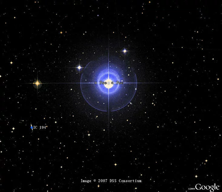 外屏七,即双鱼座α(Al Rischa)。位来自于两条"鱼"的交汇点。实际上,Al Rischa是源于阿拉伯语,意思是"索"。 外屏七为双鱼座主星。 从星图上看,α星位于两条鱼之间, 以α星为顶点的"V"则是栓住它们的绳子。