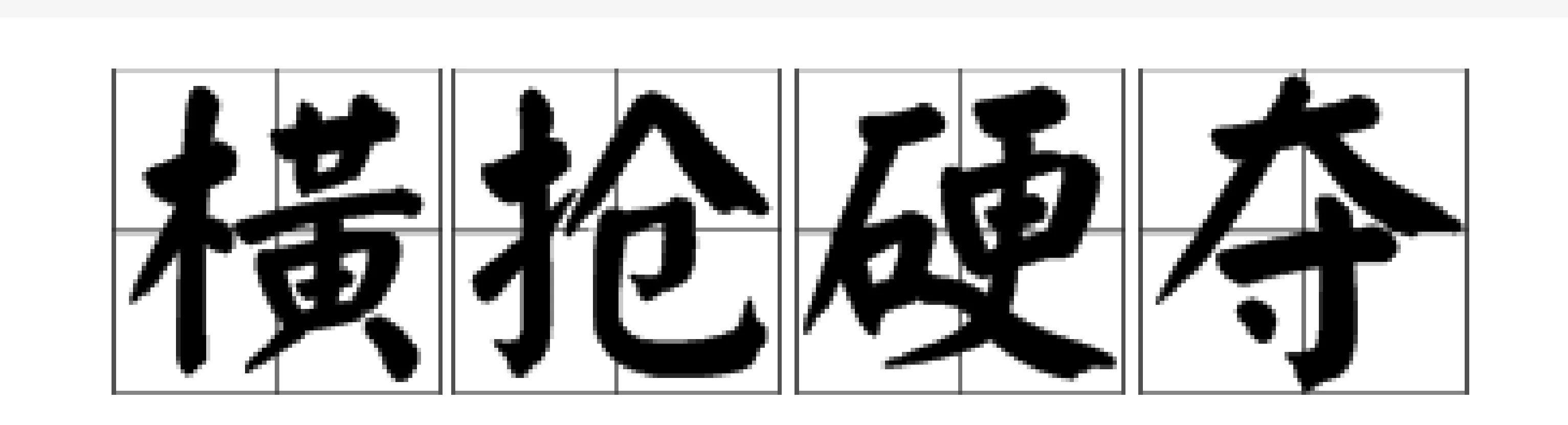 中文名称 横抢硬夺 拼音 hèng qiǎng yìng duó 解释 指用强力夺取 出处 《儿女英雄传》 【出处】《儿女英雄传》第三二回:"你瞧他们爷儿们、娘儿们,这阵横抢硬夺的,还了得了。" 点击展开全文 转载请注明出处安可林文章网 » 横抢硬夺