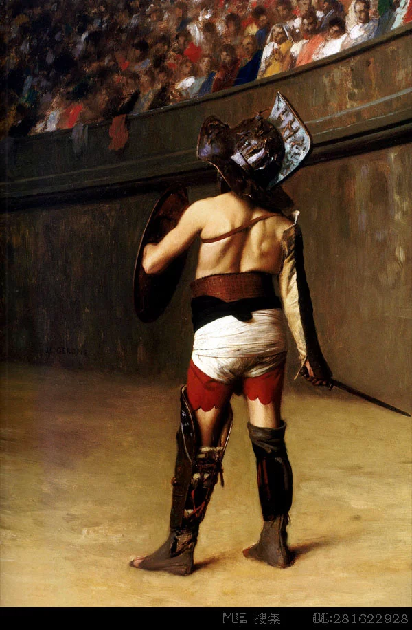 热罗姆对角斗士题材的兴趣,源于一次意大利之行。在他读美术学院三年级事额留富夫时,他的老师德拉罗什(1797-1859)为摆脱丧妻之痛,带上热罗姆和克劳(1824-1910)在意大利游历了一年阿。热罗姆后来回忆说,这是他一生中度过的最幸福的一年。在意大利逗留期间,他专心研究了那不勒斯博物馆的古典艺术藏品,并且第一次实际接触了庞贝的角斗士使用的兵器。这些经历,成了他日后创作角斗士题材画作的主要源泉。