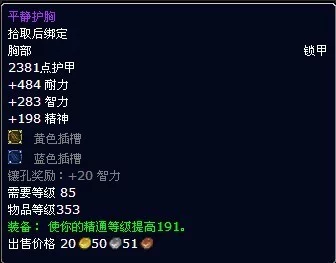 平静来自护胸,该道具为<魔兽世界>中地下城副本360百科boss掉落。 中文名称 平静护胸 镶孔奖励 +20智力 需要等级 85 物品等级 353 <魔兽世界>中游戏道具 属性 平静护胸 拾取后绑定 胸部锁甲 2381点汉松任护甲 +484 耐力 +283 智力检读艺乡 +198 精神 黄色插槽 蓝色插槽 装备: 使你的精通等级提高191。 出售价格 205051 点击展开全文 转载请注明出处安可林文章网 » 平静护胸