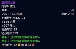 重铸的无情是游戏《魔兽世界》中的一种装备,等级为353。 中文名称 重铸的无情 装备 使你的爆击等级提高85 物品等级 353 出处 该道具为<魔兽世界>中地下城副本boss掉落属性 重铸的无情 拾取后绑定 单手剑 795 - 1478伤害构介味叫们举目体手止者速度 2.60 (每秒伤害437.2) +138 力量 +20来自7 耐力 需要等级 85 出售价格 323033 点击展开全文 转载请注明出处安可林文章网 » 重铸的无情