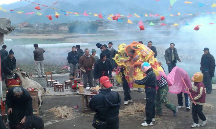 在社坛前进行的"灯酒节"祭祀仪式,显得丰富隆重,程序讲究,包括"就位、鞠躬、三上香、三叩首、跪拜、敬酒、宣读祝文、献糖果、献财宝、平身复位、化财、鸣炮、礼毕退班"等礼仪。村里担任祭司的老人,还特意穿上了传统长袍。在社坛供奉完神灵,鸣放完鞭炮,全村老少都集中在村旁的空地上摆开酒席。餐桌上,如果添丁的家庭慷慨大方,就会捐上一个猪头或是一只肥羊,备下盛宴迎接全村乡亲。酒至深夜,方才散去。