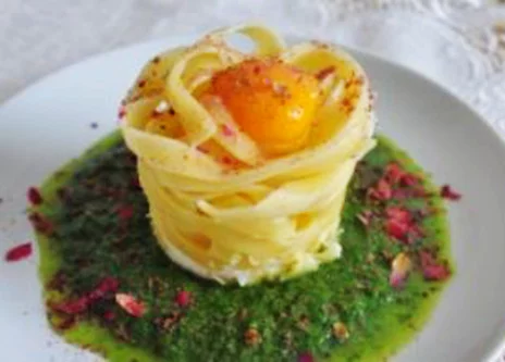 将面条卷起来,像鸟巢似地放入咖啡杯。
