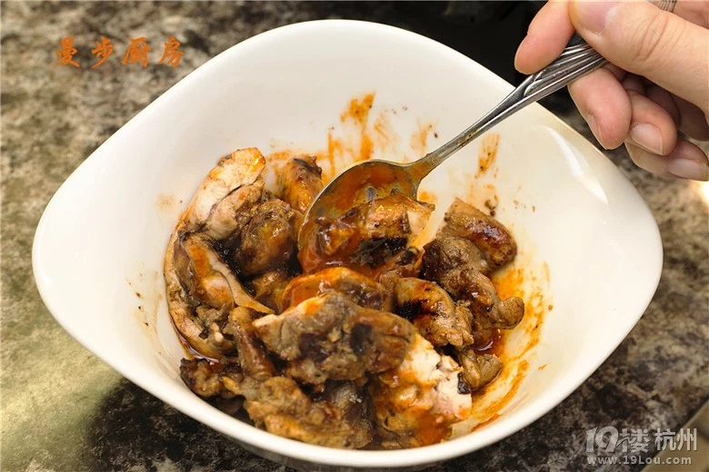 6、取下鸡腿肉撕成肉条,鸡肉放入碗中倒入油醋汁拌匀放到蔬菜盘中就可以吃了