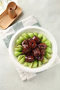 炒圈子,菜品,原料有熟圈子(猪大肠)五两、笋一两、猪油一两、红酱油八钱、黄酒五钱、水生粉二钱、葱段三钱、白糖三钱、味精三分、鲜汤二两、来自麻油三分。