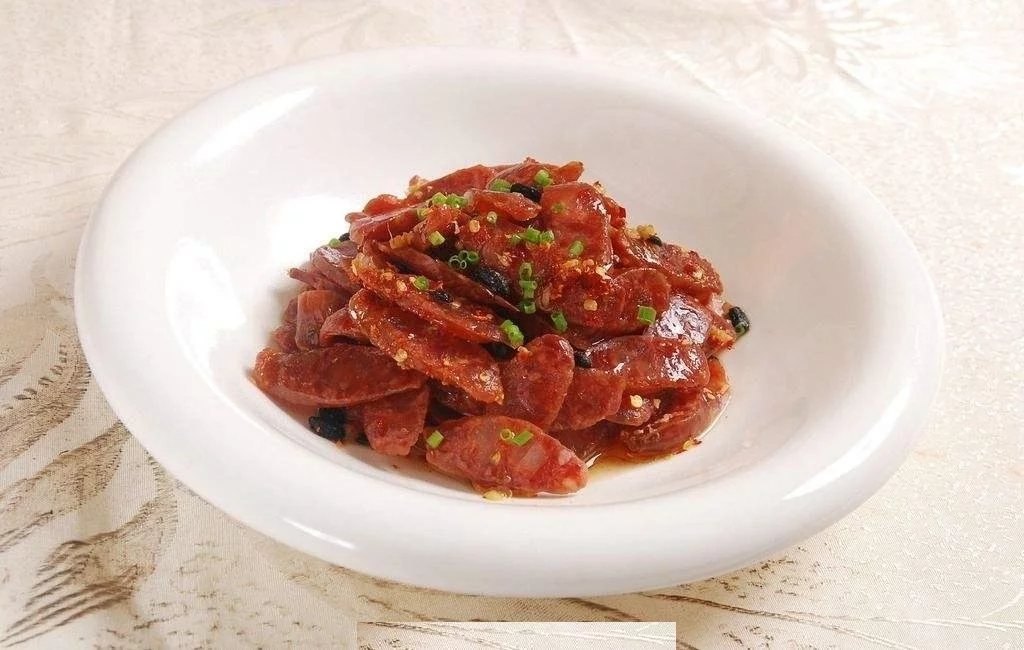 2.取貉肉香肠2 段,放入盘年,入笼蒸至热,出笼晾凉360百科切片,装盘上桌。