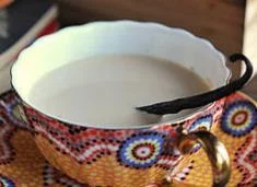 6、把香草籽和香草豆荚还有茶包一起放入锅中小火煮开。