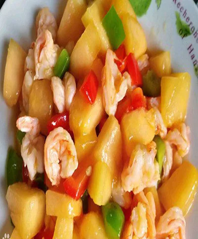 原料:哈密瓜1个(约750克),发好虾仁500克,花枝片(即鱿鱼片)250克,西芹段300克,红椒片50克。