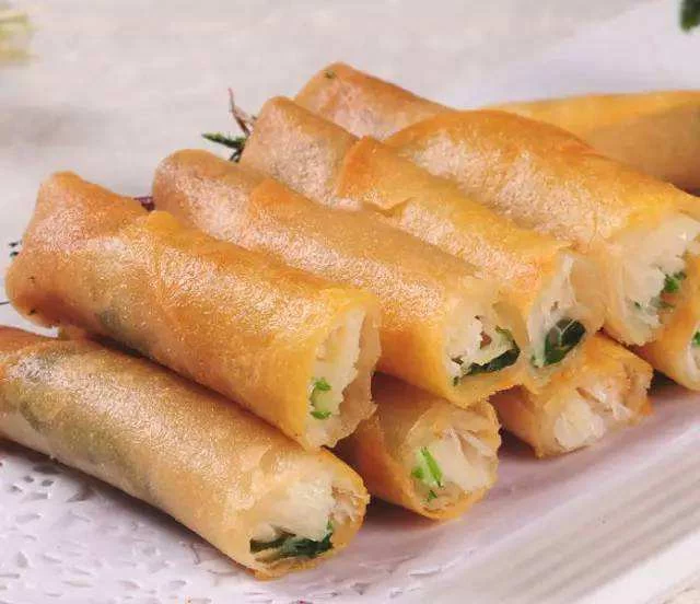 距功请 3、锅放油烧至五成热后投入培根卷炸约2分钟至熟后取出沥干。
