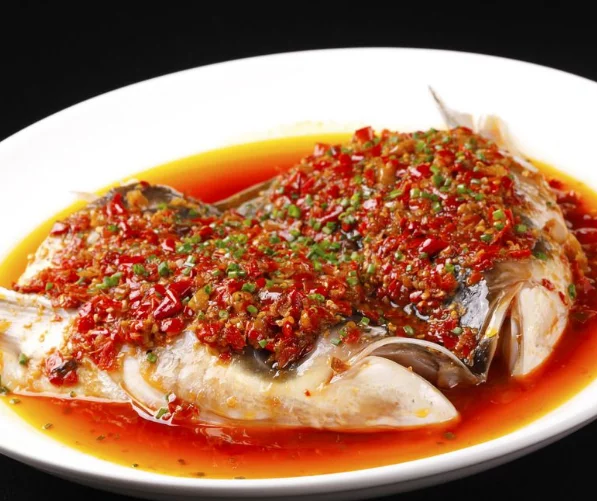 2、鱼头加盐、鸡精、味精、料酒腌渍30分钟至入味,放入盘中,上面放调好的开胃料,上笼大火蒸15分钟,取出撒香葱末,淋20克色拉油。