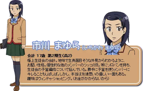 市川真由良(いちかわ まゆら),女,生日为5月18日。动漫《极上生徒会》人物之一,在动漫中是学生会的会计。 中文名称 市川真由良 外文名称 いちかわ まゆら 登场作品 《极上生徒会》 生日 5月18日 虚拟人物血型 A型 市川 真由良(いちかわ まゆら)(CV:日本:泽城美雪;香港:陈琴云),登场时17岁,宫神学园第2期来自,高二生。经常为学生360百科会紧绌的财政状况伤脑筋。 点击展开全文 转载请注明出处安可林文章网 » 市川真由良