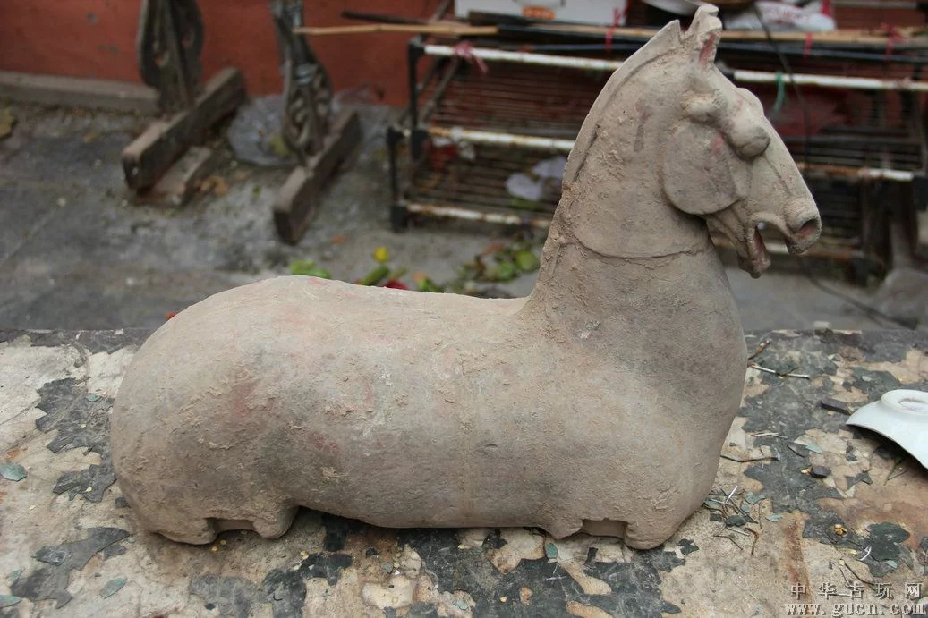 汉代随葬品。粗砂红陶,范制。马张口吐舌、翼鼻,背有鞍,呈站立状。一九八一年出土于麻浩崖墓。曾参加中国文物精品在美国的巡回展出。