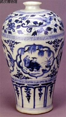 元代青花瓷以景德镇窑为代表,开辟了由素瓷向彩瓷过渡的新时代,优雅精致,与我国的传统水墨画有异曲同工之妙。元青花质地优良,画工细腻,题材众多,花卉、走兽、戏剧故事、人物等皆跃然瓷上,漂亮悦目,其制作精美但传世极少,故而异常珍贵。武汉博物馆收藏的这件元青花"四爱图"梅瓶,为元末时期江西景德镇窑烧造。