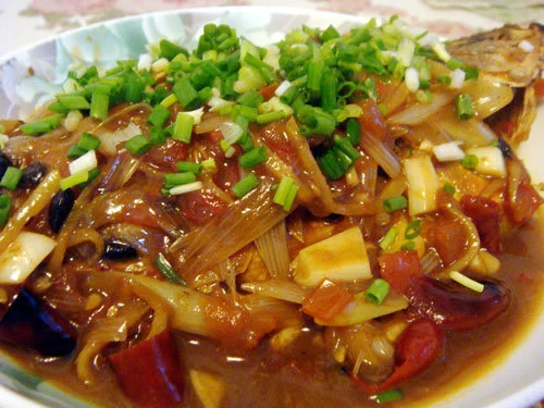 10.焖好后。把鱼盛出来。余下的汤汁大火收一下。淋入小磨香油和水淀粉。然后浇到鱼身上。然后把小葱花撒在鱼身上。就可以开吃啦。