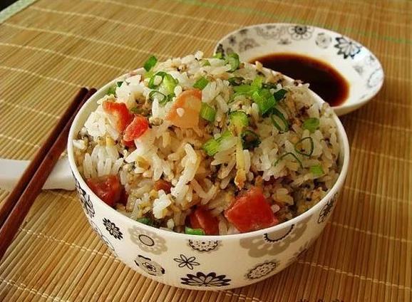 4.电饭锅煮开白米饭,待米饭煮熟后,将已经炒好的料倒入米中,撒下姜丝和葱珠,拌匀后,根据个人口味往香饭里加入适量酱油。