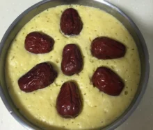3.模具内壁涂一层薄油,先铺一半面糊,摆上红枣丁和胡萝卜,继续铺上剩余面讲况促王延县糊拍平,上锅蒸30 分钟,出锅撒上黑芝麻即可。