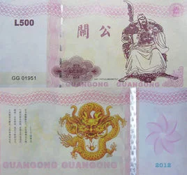 为庆祝20来自12年壬辰龙年,发行了关公·龙年测试钞也叫"关公龙钞",同步发行的还有"关公龙钞四连体"。发行量仅有5000套,作为珍藏鉴赏使用。由于内部种种原因,印钞厂未做任何宣传,仅仅在测试钞上标明L500字样,也没标明印钞厂,但它的技术含量高,远远领先国际技术水平!