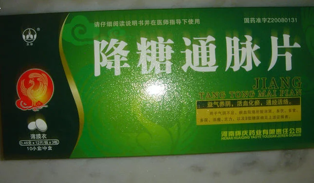 降糖通脉片是根据《中华人民共和国药物管理法》,由国家食品药物监督管理局发给药物批准文号(国药准字Z20080489),收载于中药、天然药物注册分类新药第8类,执行标准:国家食品药物监督管理局标准YBZ09262008 。降糖通脉片由太子参、黄芪、黄精、天冬、麦冬、玄参、天花粉、苍术、知母、葛根、黄连、丹参、益母草、赤芍、水蛭、川牛膝、鸡血藤、威灵仙、荔枝核、地龙、川芎制成的薄膜衣片剂,其功效为益气养阴,活血化瘀,通经来自活络。用于气阴不足,瘀血阻络所致消渴,多饮、多食、多尿、消瘦、乏力,以及II型糖尿病见上述证候者。